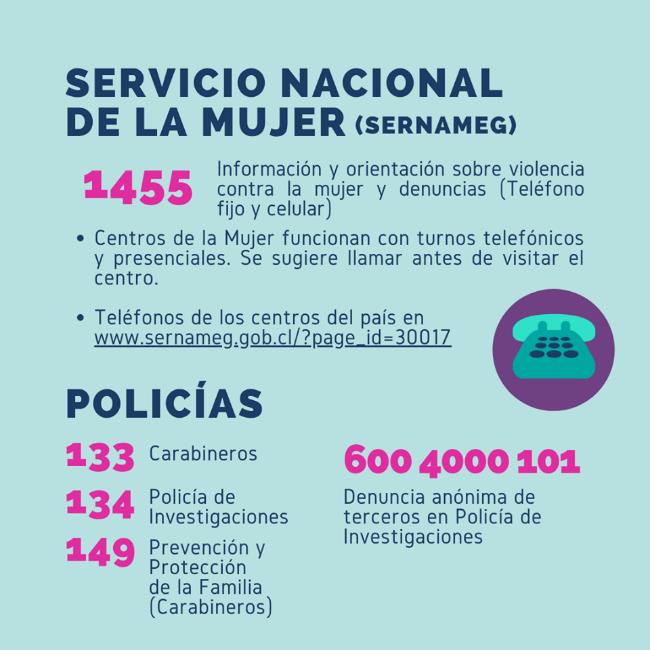 El Ministerio de la Mujer y la Equidad de Género, Fono Orientación y Ayuda 1455, que es una línea gratuita, que atiende las 24 horas y los 7 días de la semana.